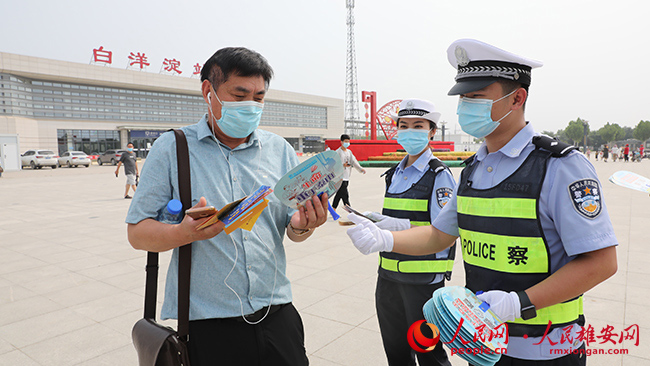 公安交警向出站旅客发放宣传手册。张娅喃摄