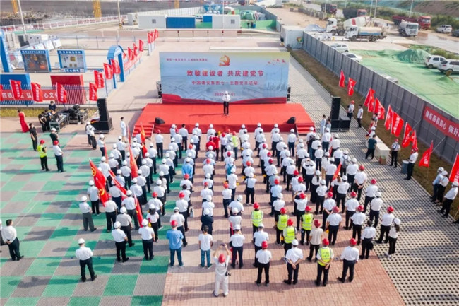 “项目一线百日行,工地处处党旗红”七一主题党日活动现场。马梦迪/摄
